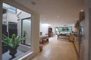 Terrace houses are often challenged for light and sun access. This design responds to arduous Council restrictions as well as significant factors relating to aircraft noise intrusion. Nevertheless, with the application of judicious use of skylights, roof windows and a north facing clerestory there is a sense of lightness that enhances the amenity in delightful ways.
